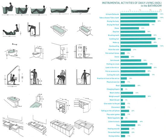 The methods and procedures used by the algorithms of ambient intelligence (AmI) to define the needs of a user are reminiscent of those used by the architect E. Neufert. when he sought architectural standardisation by breaking down human needs into a series of activities. Left: minimum spaces, furniture, and dimensions in the bathroom (Source: Prepared, by the authors and adapted from the book Architects’ Data by Ernst Neufert []). Right: Instrumental Activities of Daily Living (IADL) in the bathroom. (Source: prepared by the authors and adapted from a graphic by Martínez Arribas and Roca Sanitarios, 2015 []).