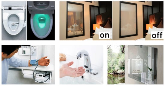 (Left): TOTO’s Intelligent Toilet features a urine “sample catcher” that can measure the glucose levels, urine temperature, and hormone levels of women trying to conceive. The wash-let, which also has the standard features of a spray-jet and heated seat, gathers data and communicates with the user’s computer by WIFI, compiling a health report. (Above right): Smart mirrors that turn opaque through facial biometric readings are a very useful function in the case of Alzheimer’s patients. (Below right): faucets with temperature and water flow sensors and smart mirrors with atmospheric information. (Source: prepared by the authors).