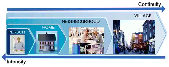 For an AAL system to be implemented in a given environment, the PERSONA project defined four different levels on which to scale the distribution of services: the person; the home; the neighbourhood or nearby geographical space; and the city or broader geographic space []. The first level is aimed at the older adult who, finding themselves in more or less difficult conditions, can directly benefit from a product, service, or system, the characteristics of which provide the user with a direct support function. The second level includes the possibility of adapting the home environment to the specific needs of the user. The third and fourth levels consist of systems, directly or indirectly assisting with social and/or affective matters and which promote inclusivity through services and technologies, which increase the potential for relationships between older adults and their family and friends (Figure 8).