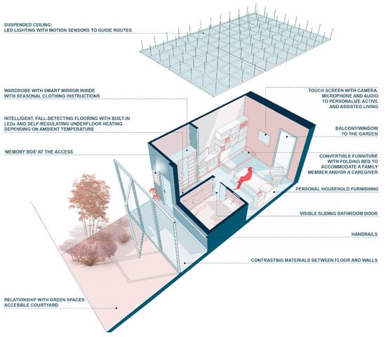Taking these considerations into account, with the progress of AAL, it will be possible to build assisted living environments that can interact intelligently and emotionally with the inhabitants, enabling them to build their own exo-brain. The architectural possibilities are of great interest, in combination with installations, wireless sensor networks, smart grids, the possibilities of retrofitting IoT, improving accessibility, etc. Architecture as a technique will integrate intelligent assistance systems into buildings, embedded within environments in such a way that they may interact invisibly and proactively with the occupants (Figure 10). This will enable the creation of assisted spaces to promote a healthier, safer, and more comfortable life, one in which each person adequately manages and controls their physical, everyday reality with more personal autonomy.