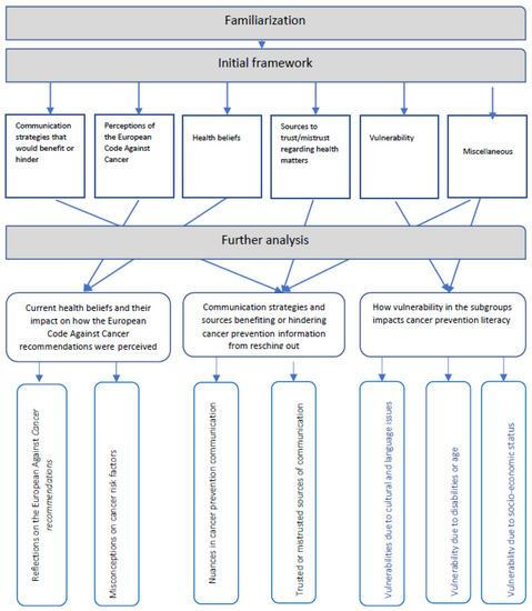 In FA, the researchers often begin the analytic process with an initial framework that is based on what is already known and/or what appears mostly relevant. In the current study, we developed an initial framework based on the following: the previous literature related to cancer prevention literacy, the field notes taken during the FGIs and the first stage of the analytic process (the familiarization). The initial framework included the following six themes: communication strategies that would benefit or hindering; perceptions of the ECAC recommendations; health beliefs; sources to trust/mistrust regarding health matters; vulnerability; and miscellaneous (where potentially interesting findings were listed that did not fit into any of the other initial themes) (Figure 2).
