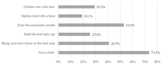 The main occupations reported by GSWs were filling station attendant (47.2%), convenience store employee (25.3%), and manager/employer in charge (15.1%). Their most commonly reported length of work was up to ten years for 81.1% of GSWs and 70% of SCWs (Table 2). Some concerning occupational habits reported by filling station attendants and managers/employers were using cloths and flannels when fueling (73.5%), bringing their face closer to the fuel tank when filling up (40.9%), using clothes wet with fuel during their working time (29.3%), sniffing the fuel tank cap (25.6%), and sucking the fuel with their mouth using a hose (19.1%) (Figure 1).