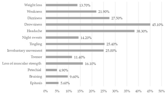 The most described signs and symptoms of the GSWs, including convenience store employees, were drowsiness (45.1%), headache (38.3%), dizziness (27.5%), tingling (25.4%), involuntary movement (25%), and weakness (21.9%) as can be seen in Figure 2.