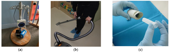 Illustration of some environmental measurements performed in daycares. (a) Indoor air sampling for aldehyde and VOC analysis; (b) Settled dust sampling with cellulose cartridge for SVOC analysis; (c) Settled dust sampling with Mitests® for microbiota analysis.