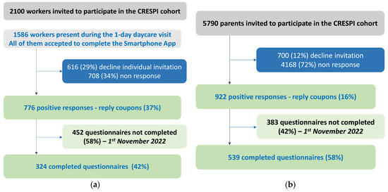 Summary of recruitment—preliminary results. (a) Summary of daycare workers recruitment; (b) Summary of children recruitment. Around 37% of workers (776/2100) agreed to participate at the first step (a). This response rate can be considered as underestimated—as only 1586 workers were at work the day of the visit—and is rather around 49% (776/1586). For the parents, 16% of them (922/5790) have responded positively and 12% (700/5790) have declined to participate. We have not received replies for 72% (4168/5790) of the parents (b). However, finally, only ~50% of them returned their questionnaires.