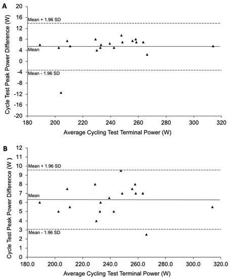 A Bland–Altman plot (Figure 1A) indicated all but one of the participants performed the same in both ramped cycling tests. In accordance with the Bland and Altman procedure [29], the data for this participant was removed from all further analyses. A revised Bland–Altman plot (Figure 1B) indicated a high level of repeatability in cycling test performance for the remaining 19 participants, which was corroborated by the high Pearson’s Product Moment Correlation coefficient value, r(18) = 0.998, p < 0.0001, and the low regression equation intercept value, Test 2 Power = (0.9963 × Test 1 Power) − 5.374.