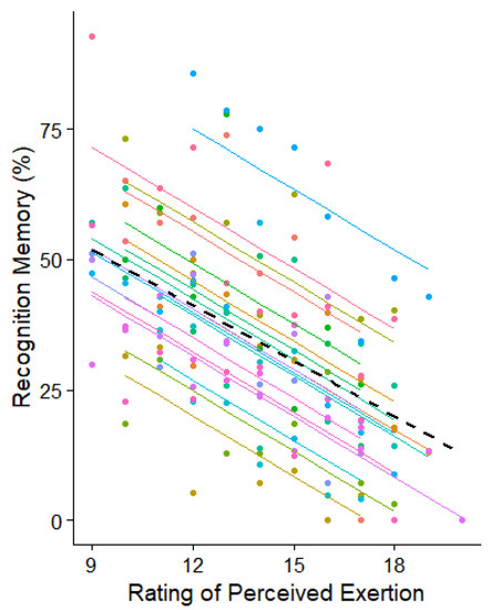Repeated measure correlation plot between memory recognition and perceived exertion. Each participant is indicated with a different colour.