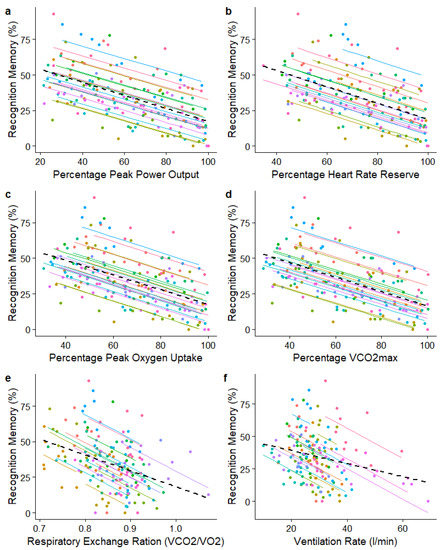 Repeated measures correlation plots between memory recognition and peak power output (a), relative heart rate reserve (b), percent of oxygen uptake (c), percent of peak carbon dioxide production (d), respiratory exchange ration (e), and ventilation rate (f). Each participant is indicated with a different colour.