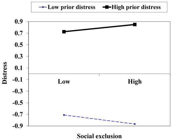 Standard score of distress by high (1 SD above M) and low levels (1 SD below M) of experienced social exclusion and prior distress.