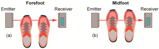 ADR Jumping arrangement with the emitter facing the forefoot (a) and midfoot (b).