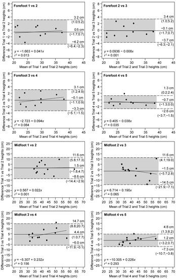 Table 1 shows the mean, difference, and the confidence limits for 95% values of the jump height for both methods. Statistically significant differences were observed between the forefoot and midfoot methods, characterized by large effect sizes.