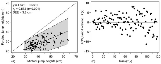 Correlation analysis between the forefoot and midfoot methods in the ADR jumping photocell. (a) Passing and Bablok regression, (b) residuals plot. Solid line: regression; shaded area: 95% confidence intervals of the regression line; dotted line: x = y line; rs: Spearman’s correlation coefficient; SEE = standard error of estimate.