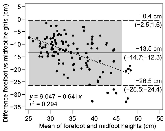 Figure 4 depicts the Bland–Altman plot between the two methods. Although 95% of the data were included inside the LoAs, representing good agreement, the width of LoAs (−26.5 to −0.4 cm) indicates the presence of random error, all of which lay outside the line of total agreement. The systematic error can be quantified as an overestimation of 13.5 cm for the midfoot method (95% CI: −14.7 to −12.3 cm). In addition, the tendency for the differences to increase in absolute value as the height of the jumps increases indicates proportional error (heteroscedasticity). The negative slope (−0.64, p < 0.001) of the fitted line (dotted) shows that the overestimation of the midfoot method increases with jump height (r2 = 0.294).