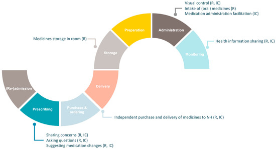 Although residents and informal caregivers did not acknowledge any other involvement in the medicines’ pathway, they provided examples showing behaviors of involvement in different processes of the resident’s medicines’ pathway, with the exception of the (re-)admission process (see Figure 1).