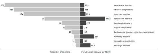 Reasons for readmission after a diagnosis with insomnia are presented in Figure 1. Of the 791 readmissions captured among patients with insomnia, the most common principal diagnoses for readmission were hypertensive disorders (n = 206, 26.0%), infectious complications (n = 181, 22.9%), mental health disorders (n = 97, 12.3%), and hematologic disorders (n = 50, 6.3%). Among all 30-day postpartum readmissions, insomnia was highly prevalent among those readmitted for mental health disorders (117.2 cases per 10,000 readmissions), pulmonary disorders (66.5 cases per 10,000), and neurologic disorders (49.3 cases per 10,000). Table 3 shows the odds of readmission for index hospitalizations affected by insomnia based on individual readmissions classifications.