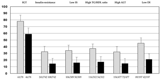 Percentage of youths with impaired glucose tolerance (IGT), insulin resistance, low insulin sensitivity (IS), high triglycerides to HDL-cholesterol ratio (TG/HDL ratio), high alanine aminotransferase (ALT), and low disposition index (DI) in youths with G60 ≥ 133 mg/dL (grey bars) or G60 ≥ 155 mg/dL (black bars) (p < 0.0001 compared to their respective counterparts < 133 mg/dL or G60 < 155 mg/dL). Youths in the G60 ≥ 133 mg/dL group showed an increase of 33% for IGT, 123% for IR, 104% for low IS, 112% for high TG/HDL ratio, 114% for high ALT, and 103% for low DI, with respect to individuals in the G60 ≥ 155 mg/dL group.