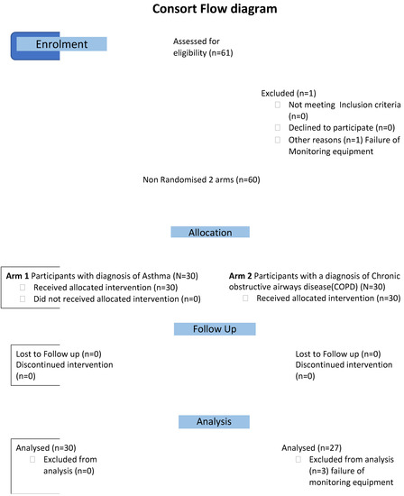 Baseline characteristics of the participating patients by their diagnosis were compared using descriptive statistics (mean, standard deviation (SD), median, interquartile range (IQR) and percentages as appropriate). The Student t-test for continuous variables and Chi-square test for categorical variables were used to determine whether there was a difference in the breathing rates among the variables of interest, and a two-tailed p-value, with a less than 0.05 significance threshold, was chosen for all tests. Stata v16 (Stata Corp LP, College Station, TX, USA) was used for the statistical analysis.