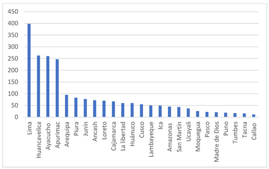 The implementation of telehealth services implies not only updating infrastructure with certain technologies [21] but also the infostructure of health-information systems, regulatory frameworks related to telehealth and digital health, the training of health professionals on digital health and health management, and data-science management, as well as addressing leadership and administrative issues for improving telehealth in Peru. [6,11]. The number of healthcare centers that implemented telehealth services in Peru during the beginning of the COVID-19 pandemic [22] is presented in Figure 1. Most telehealth services are provided in Lima, the capital of Peru.