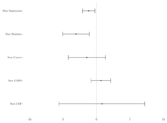 To see if new diagnoses of other common caregiver health conditions have a similar effect, the analysis is repeated for caregivers with a new diagnosis of cancer (all HSS-HCC codes involving neoplasms), diabetes mellitus, congestive heart failure (CHF) or coronary artery disease (CAD), and chronic obstructive pulmonary disease (COPD).
