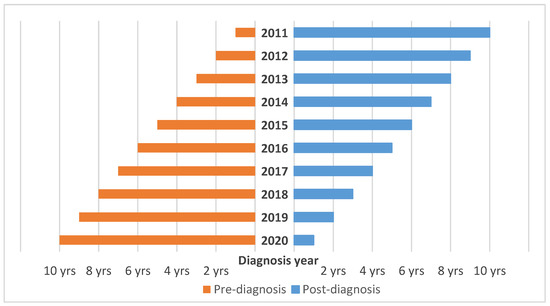 The study cohort will be derived from the South Australian Cancer Registry (SACR). Cancer is a legally notifiable disease in all states and territories in Australia, requiring the reporting of all cancers except basal and squamous cell skin carcinomas [21]. All South Australian (SA) residents aged 18 and older diagnosed with cancer, excluding non-melanoma skin cancer, between 1 January 2011 and the latest available data, which is estimated to be 31 December 2020, will be eligible for inclusion in the study. Healthcare utilisation data (i.e., hospital inpatient and ED data, and Medicare Benefits Schedule (MBS) and Pharmaceutical Benefits Scheme (PBS) data) were requested from 1 January 2010 for each identified patient. All patients will therefore have at least one year of pre-diagnosis data available and between one and ten years of post-diagnosis data depending on the year of cancer diagnosis, as depicted in Figure 1. A study sample size of approximately 103,000 cancer patients is expected. SA is the fourth largest of Australia’s states and territories (984,321 square kilometers) [22] with a population of 1.8 million [23] and three-quarters of residents living in metropolitan Adelaide [24].