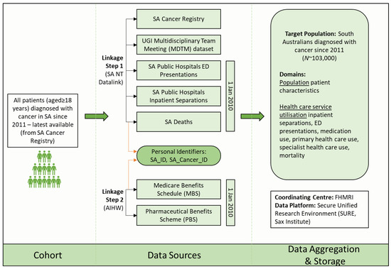 SA NT DataLink is part of the Population Health Research Network (PHRN), an Australian wide national data linkage network, where SA NT DataLink is responsible for data linkage for South Australian and Northern Territory datasets [25]. SA NT DataLink will extract the study cohort from the SACR, link to SA Public Hospital inpatient separations, SA Public Hospital ED presentations, SA Deaths, and the Upper GI Multidisciplinary Team (MDT) database for a subset of patients diagnosed with upper GI cancer. Once completed, the requested content data will be uploaded to the Secure Unified Research Environment (SURE), SAX Institute, with a new project-specific person ID called SA_ID. Thereafter, SA NT DataLink will send the cohort personal identifiers to the Australian Institute of Health and Welfare (AIHW) with the SA_ID and the SA_Cancer_ID (Figure 2). SA_Cancer_ID was previously provided to AIHW with SA data to be loaded to the Australian Cancer Database and may assist with the linkage. Once received, AIHW will link the cohort to the Commonwealth MBS and PBS dataset. Once completed, the requested content data will be uploaded into SURE with the SA_ID. Under no circumstances will the researchers have access to the file that links the personal information of individuals to the SA_ID. This is controlled by SA NT DataLink with strict data controls. All data transfers will involve encrypted files sent via a secure messenger service. All unit record data will be stored and accessed through SURE [26]. Any summary data approved for release through the SURE curated gateway will be stored at Flinders University on password-protected computers.