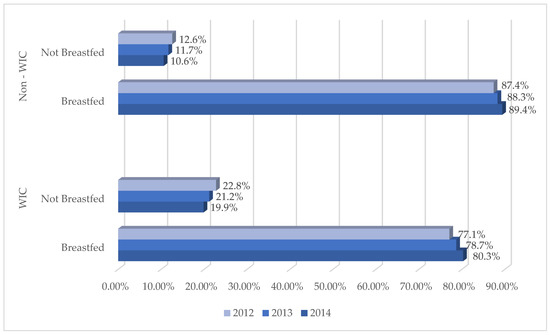 For our study, trends in breastfeeding inequalities between 2012 and 2014 were examined using data from the State of Florida’s Bureau of Vital Statistics Birth Records. Specifically, the outcome studied was breastfeeding initiation, i.e., being breastfed. Given the increased breastfeeding support provided by WIC to low-income women [14,29,31], this study looked at breastfeeding inequalities, such as differences in breastfeeding initiation outcomes between WIC participants and non-WIC participants, and also assessed the change in breastfeeding initiation rates over a 3-year timeframe. This study offers a unique viewpoint on evaluating WIC program nutrition education and interventions on breastfeeding practice by comparing breastfeeding outcomes among WIC participants to nonparticipants in the entire state of Florida, taking a variety of sociodemographic factors into account. In addition, the study assesses factors that impact breastfeeding initiation in a multivariable logistic regression analysis.