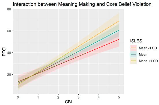 Our second predictor, meaning-making, further suggests that personal growth is enhanced by the ability to develop an understanding of a stressful event and to integrate this experience into one’s belief system. However, we found that the predictive power of meaning-making as measured by the ISLES, while significant, was lower than that associated with core belief violation as measured by the CBI. While speculative, one explanation for this finding is that the assault on core meanings regarding predictability, justice, benevolence and control is a primary impetus for reviewing and revising one’s world assumptions, whereas meaning-making about one’s pandemic experience plays a secondary and supporting role in promoting growth. This suggests the importance of considering the two in combination, as in the interaction analysis discussed below.