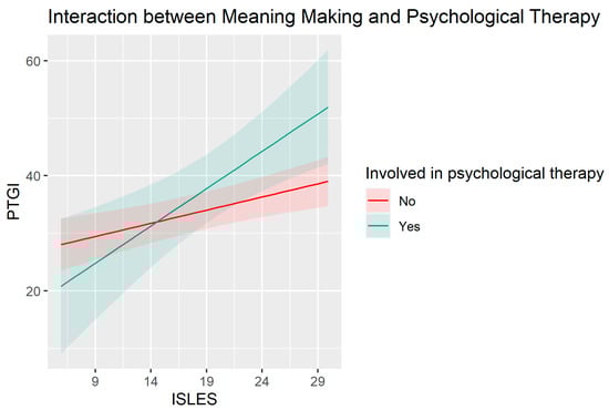 Finally, our last hypothesis (H4) was only partially supported. Our data did not show a direct predictive value of being in psychotherapy on PTG. However, the results of the supplementary analyses suggested that psychological therapy significantly influences the association between meaning-making and PTG. In fact, although greater meaning-making ability is generally linked to a greater perceived PTG, this association is significantly stronger for people who were involved in psychological therapy during the pandemic. The synergistic effect of meaning-making in the context of therapy further suggests the possible value of forms of professional intervention that have sense-making regarding stressful events, and the priority of finding renewed meaning in life in their aftermath as central objectives of the therapy, supported by relevant procedures. Such goals and techniques feature prominently in meaning reconstruction therapies for loss, for example []. However, the finding that therapy in conjunction with meaning-making is especially salutary requires replication with a larger sample of therapy clients.