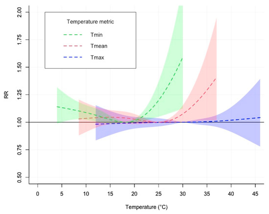 The cumulative exposure–response relationship between different temperature metrics (Tmin, Tmean, and Tmax) and road crashes compared with MCT for 5 lag days in Adelaide. The dark-color dotted lines represent RR, and the light-color shaded regions represent 95% CI. Tmin: daily minimum temperature; Tmean: daily mean temperature; Tmax: daily maximum temperature; RR: relative risk.