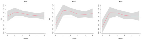 Figure 1 illustrates the cumulative exposure–response relationship between daily temperature (Tmin, Tmean, Tmax) and road crashes cumulative over lag days 0–5. A nonlinear association was observed for each temperature metric. The trends in the overall cumulative exposure–response relationships between different temperature metrics and road crashes were similar. Specifically, the exposure–response relationship exhibited a J-shaped curve, with a substantially increased risk of road crashes when the daily minimum temperature exceeded 18.1 °C and the daily mean temperature exceeded 24.8 °C. However, there was a less significant increase in the risk of road crashes with increases in the daily maximum temperature. Figure 2 shows the effects of heat on road crashes along the lags for extremely high ambient temperatures at the 99th percentile (Tmin: 25 °C, Tmean: 33 °C, and Tmax: 42 °C). The effects of extremely high temperatures on road crashes peaked at a lag of 1 day, followed by a cumulative effect until a lag of 5 days. Three-dimensional plots of the overall exposure–lag–response associations and the overall cumulative exposure–response relationships with temperature distributions (Tmin, Tmean and Tmax) can be found in Supplementary Materials (Figures S2–S4). The results of the quasi-Poisson DLNM estimation of the temperature distributions (Tmin, Tmean, and Tmax) and road crashes can be found in Supplementary Material (Tables S1–S3).