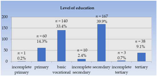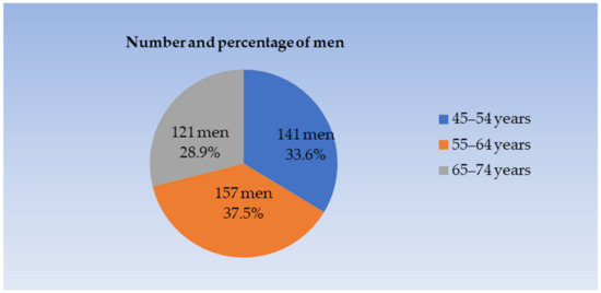 A total of 419 men, who were invited to participate in this study, answered the questionnaire, underwent clinical examination, and were enrolled. The response rate was 100%. The demographic and socioeconomic characteristics of the participants are summarized in Figure 1, Figure 2 and Figure 3. The male subjects aged 45–74 years (mean age 60.0 ± 8.1 years) were divided into three age groups (Figure 1):