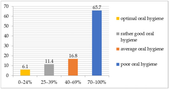 The results of our study indicate that the studied patients’ inadequate state of oral hygiene—the average API of the toothed men was 77%. In other studies conducted in Poland among men aged 65–74, the average API ranged from 67 to 75.8%, which is lower or similar to the obtained results [22,23]. Particularly noteworthy is the highest percentage of men (65.7%) characterized by improper oral hygiene, despite the fact that they were notified by letter about the scheduled dental examination. Similar results were obtained among senior citizens (aged 60–75) from Salvador using the simplified Oral Hygiene Index (OHI), where the percentage of men with poor oral hygiene was 67.8% [19].