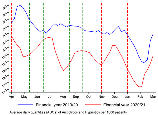 The ADQ is calculated by dividing the total number of dispensed doses of a specific medication by the number of patients who take that medication and then multiplying it by the number of days for which the medication was dispensed. The resulting value is then standardized by dividing it by 1000 to account for differences in the size of the population being studied. Monthly practice-level ADQ of anxiolytics and hypnotics data were downloaded for the study period.
