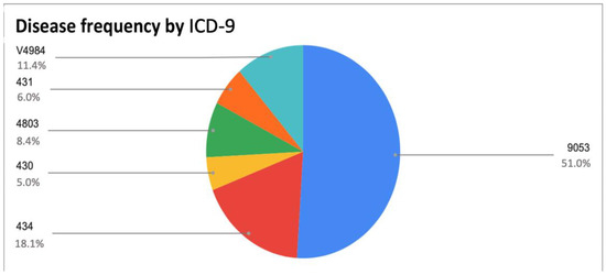 Frequencies of diseases as evaluated using ICD-9. The relevant codes are shown, namely, 9053 (late effect of fracture of neck of femur), 434 (cerebral thrombosis), V4984 (bed confinement status), 4803 (pneumonia due to SARS-associated coronavirus), 431 (intracerebral hemorrhage), and 430 (subarachnoid hemorrhage).