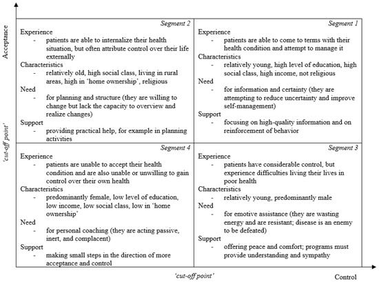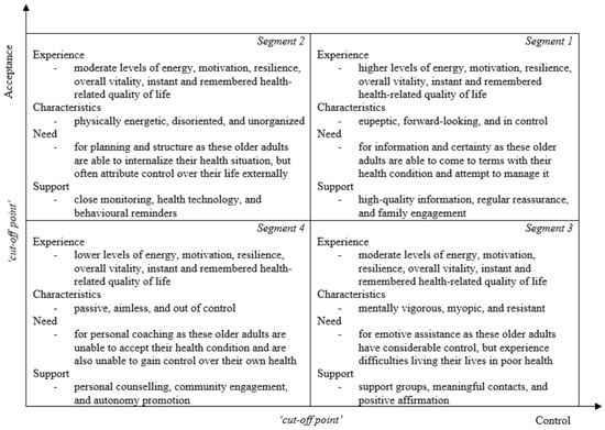One method utilized to obtain an accurate indication concerning the appropriate support for older adults with different levels of vitality and health-related quality of life is segmentation [8,20]. An often-utilized segmentation model in healthcare is the Subjective Health Experience (SHE) model developed by Bloem et al. and extended by Broekharst et al. (Figure 2) [8,20]. This segmentation model constitutes four segments that each describe a particular subjective health experience profile, namely, health experience, population characteristics, healthcare needs, and appropriate support, based on the two central determinants of subjective health experience, namely, acceptance and control [8,20]. Individuals in segment 1 are able to come to terms with their health condition and attempt to manage it (high acceptance, high control) [8,20]. These individuals need high-quality information and reinforcement of desirable behavior (information and certainty) [8,20]. Individuals in segment 2 are able to internalize their health situation, but often attribute control over their life externally (high acceptance, low control) [8,20]. These individuals need practical assistance with regard to, for instance, planning activities (planning and structure) [8,20]. Individuals in segment 3 have considerable control, but experience difficulties living their lives in poor health (low acceptance, high control) [8,20]. These individuals need peace and comfort as well as understanding and sympathy (emotive assistance) [8,20]. Individuals in segment 4 are unable to accept their health condition and are also unable or unwilling to gain control over their own health (low acceptance, low control) [8,20]. These individuals need personal attention in order to make small steps in the direction of more acceptance and perceived control (personal coaching) [8,20].