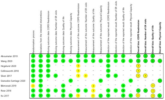 - Majothi, S.; Jolly, K.; Heneghan, N.R.; Price, M.J.; Riley, R.D.; Turner, A.M.; Bayliss, S.E.; Moore, D.J.; Singh, S.J.; Adab, P.; et al. Supported self-management for patients with COPD who have recently been discharged from hospital: A systematic review and meta-analysis. Int. J. Chron. Obstr. Pulm. Dis. 2015, 10, 853–867. [Google Scholar] [CrossRef]