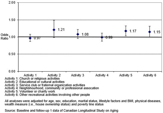 4.1.2. Research Question 1b: Do Those Who Participate in Social Activities at Baseline Have Higher Age–Sex-Adjusted Odds of Successful Aging at Time 2?