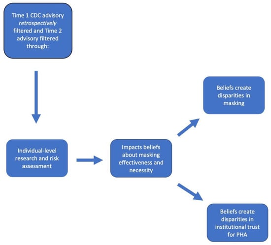 As others have noted, prevention of disease spread in society is a fundamental function of PHAs like the CDC, and clear, consistent communication with the public about risk and prevention is key to stemming transmission [,,]. However, compliance with PH advisories, especially those that require significant changes to daily routines like COVID-19 has, is dependent upon individual risk perception and trust in government, amongst other factors [,]. Because of the nature of COVID-19, governments and public health authorities have had to work at break-neck speed to make complex policy decisions in the context of nascent but rapidly evolving science []. Often, in the earliest days, these decisions were made, in better scenarios, with pre-print research, and in the worst scenarios, based on what PHAs did not know about the transmission of the virus []. As a result, PH guidance in the United States, especially regarding masking, risked the appearance of contradicting itself to the lay public, even while PH researchers were empirically building on recent scientific research. Public trust and cooperation is one of the many variables on which PHAs must depend when working to stem spread of an emerging infectious disease [,]. However, the appearance of backtracking on guidance is significant in the public eye and can be viewed as evidence supporting why PHAs should not be trusted. Inconsistent levels of trust from the public can, therefore, create disparities in preventative behavioral outcomes [].