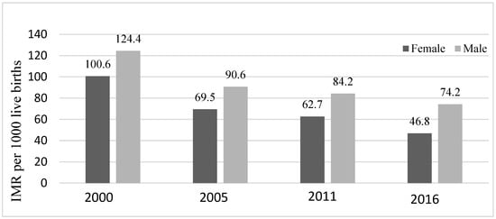 We analyzed four inequality dimensions of infant mortality in Ethiopia (sex, residence type, mother’s education, and household wealth). Our analysis has revealed that inequalities related to most of these factors still exist; however, differences arising from residence type, mother’s education, and household wealth were narrowing with the exception of sex-related inequality where male infants were markedly at a disadvantage. Consistent with the global trend of improving survival and declining infant mortalities [], overall infant mortality in Ethiopia has significantly decreased over the years. However, we found significant inequalities between the sexes. The absolute difference between male and female infant mortalities from 2000 to 2016 ranged between 21.1 and 27.5 deaths in favor of female infants. Regardless of extensive documentation of gender-based inequalities (i.e., sex of the child) in infant mortality in a global context in the previous literature [,,], the significance of differences in infant mortality rate, trend, and patterns is wildly varied and related to intricate social and economic factors within and among countries [], including the use of new medical therapies.