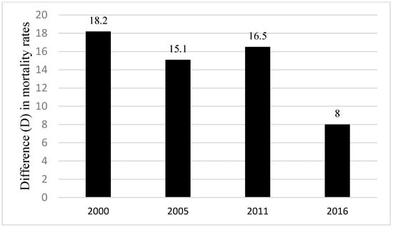 Overall, the infant mortality rate in Ethiopia has decreased from 124.4 and 100.6 deaths per 1000 live births in 2000 to 74.2 and 46.8 in 2016, for male and female infants, respectively, representing a decrease of 40.4% among females and 53.5% among males. The decrease was, however, incremental for both sexes over the years (Figure 1), with male infants consistently having higher infant mortality rates than the females (Figure 1 and Figure 2). In 2000, the absolute difference (D) in mortality rates among female and male infants was 23.8 deaths per 1000 live births in favor of females. However, in 2016, although both sexes had the lowest infant mortalities in 16 years, the inequality between female and male infant mortalities was the largest. Absolute sex related difference (D) in morality was 27.5 deaths per 1000 live births in favor of female infants (Figure 2).