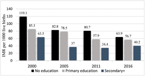 Infant mortality rate per 1000 live births disaggregated by mothers’ education (DHS* 2000, 2005, 2011, 2016) Note: IMR = Infant Mortality Rates; DHS* = Demographic and Health Surveys.