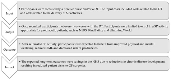 SP involves referring patients with prediabetes to non-clinical, community-based interventions via a link worker, also known as a community navigator or health advisor [15]. Promoting a person-centred approach, SP offers patients access to therapeutic activities within a safe environment, coupled with mentor support. Research suggests that SP can lead to numerous benefits, including increased confidence and productivity [16], reduced levels of depression and anxiety, [17,18], and a reduction in the number of general practitioner (GP) and accident and emergency (A&E) visits [19,20]. SP activities can also reduce diabetic causal factors, including reduced waist circumference and decreased body mass index (BMI) [21]. Such effects can be vital in the long-term prevention of T2DM.