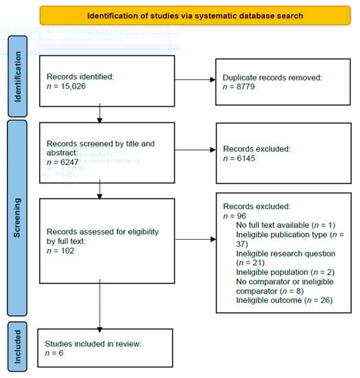 The study selection process is detailed in the PRISMA flow diagram included in Figure 1 [34]. A total of fifteen-thousand-twenty-six citations were retrieved from the five bibliographic databases in our systematic search strategy. Following automatic duplicate removal by Covidence, 6247 citations were retained for Level 1 (title and abstract) screening. A total of one-hundred-two potentially relevant articles identified in the systematic search progressed to Level 2 (full text) screening, of which six articles were selected for data extraction and risk of bias assessment. Two potentially relevant articles were identified from the complementary search of citations in the reference lists of three key review articles [29,30,31]; however, both were excluded after full-text review due to ineligible outcomes. Finally, in a complementary search of web-based literature, no potentially relevant citations were identified within the first 1000 Google search results. Articles that were excluded during full-text review are summarized in Table S8, along with reasons for their omission.