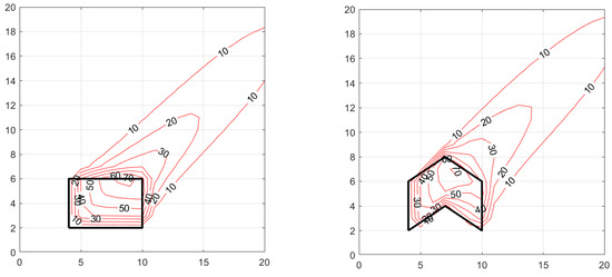 Figure 5 and Figure 6 show the concentration patterns associated with different shaped area sources for two wind directions and . The dimensions of the area sources and the surrounding domain are in arbitrary units. The area of all the sources is 24 units, and the emission rate, is 1000 units. The associated micrometeorology are wind speed, at a reference height, , friction velocity, , standard deviation of horizontal cross-wind velocity fluctuations, , and Monin–Obukhov length, . The release is at 1 m surface, and the concentrations are also computed at z = 1 m.