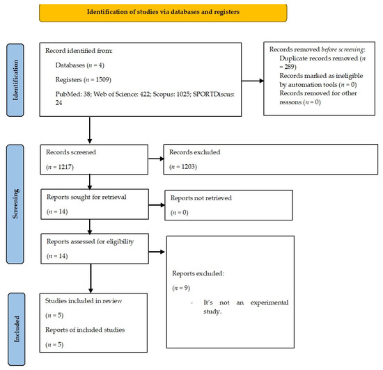 A total of 1509 studies were identified through searching the databases. In the first phase, which included reading titles and abstracts, 14 studies were identified as potentially relevant for the study. Considering the previously defined eligibility criteria and after the full reading of the articles, five studies were identified as meeting the eligibility criteria and included in this systematic review for a full analysis. Figure 1 represents the flow chart of this systematic review.