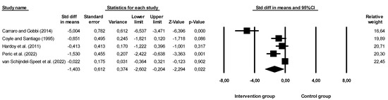Effectiveness of interventions on depressive symptoms. Note: Carraro and Gobbi (2014), [46]; Coyle and Santiago (1995), [47]; Hardoy et al. (2011), [48]; Peric et al. (2022), [49]; van Schijndel-Speet et al. (2022), [50].