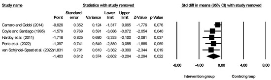 Leave-one-out sensitivity analyses for the effectiveness of the intervention on depressive symptoms. Note: Carraro and Gobbi (2014), [46]; Coyle and Santiago (1995), [47]; Hardoy et al. (2011), [48]; Peric et al. (2022), [49]; van Schijndel-Speet et al. (2022), [50].