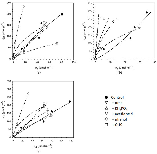 Sorption of PhACs ((a) sulfadiazine, (b) atenolol, (c) caffeine) to soil (topsoil of a Haplic Cambisol) in the absence (Control) or presence of different model compounds representing chemical constituents of manure, added to soil at 5 mmol·g−1. Dissolved and adsorbed equilibrium concentrations are displayed (mean values with standard deviation as error bars) and were fitted using the Freundlich isotherm model (Equation (1); lines). Note the different scaling of the axes in the sub-figures. Data for the control were taken from [46].