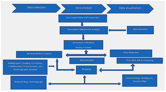 Flowchart of bibliometric processing of information (source []). NB: PCA, principal component analysis; MCA, multiple correspondence analysis; MDS, multidimensional scaling.