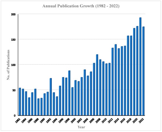 In the study period between 1982 and 2022, a total of 3763 articles were published by 10,557 authors across 512 journals. Detailed information regarding the presentation of the exported data for the analysis is shown in Table 1. In terms of author/article analysis, values of 0.356, 2.81, and 5.52 were obtained for an article per author, author per article, and co-author per article, respectively. Notably, 120 (1.43%) authors published articles as single authors, while 10,437 (98.9%) authors published articles as multiple authors, with a collaborative index of 2.89.